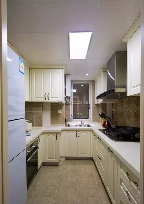 廚房在餐廳的對面,面積相對來說還行,利用U字型的櫥柜設(shè)計,同時墻面和地面是復(fù)古文化磚,與白色的柜子形成對比,讓整個廚房的設(shè)計變得更加高端有品位,而且白色的櫥柜臺面上,也顯得特別干凈衛(wèi)生。