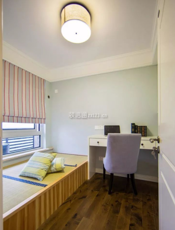 書房面積就更加小了,所以只能利用榻榻米裝修,并且更好的利用起飄窗區(qū)域,在這里并沒有設(shè)計床位,而是成為家里的休閑區(qū)域,或者說是書房工作區(qū)域,可能以后會成為孩子的兒童房吧?