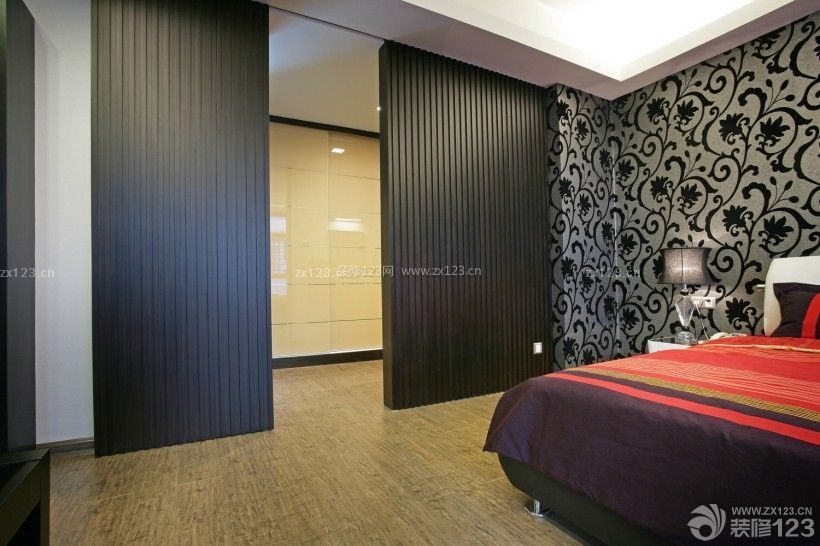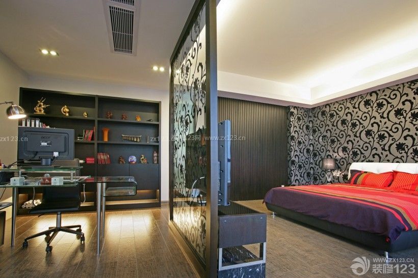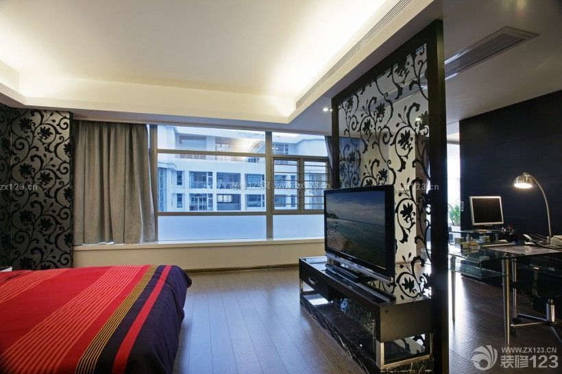 主臥室運(yùn)用帶裝飾圖案點(diǎn)綴的雕花隔斷,滿足電視墻功能的同時(shí),也巧妙的劃分了休息與工作的區(qū)域劃分。