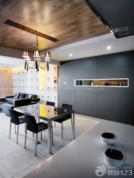 簡(jiǎn)約吊燈在木質(zhì)吊頂主墻上倒映晶燦光影,增添用餐時(shí)光的奢美氣質(zhì)。