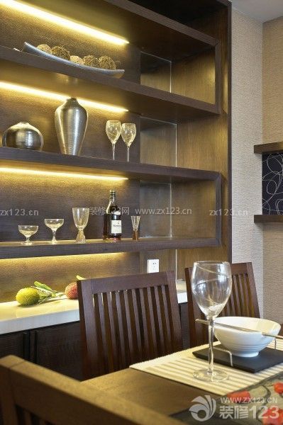 酒柜的設(shè)計(jì)呈現(xiàn)出層次飽滿(mǎn)的立面表情,個(gè)性化的展示層架,在空間中成為公領(lǐng)域的視覺(jué)端景。