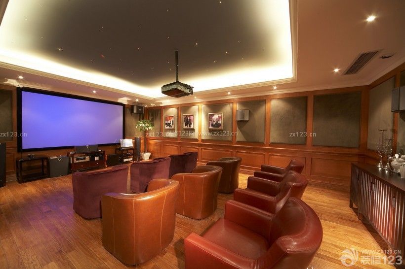將木地板、沙發(fā)、墻面都采用淺棕色調(diào),營(yíng)造舒適溫馨的家庭影院。