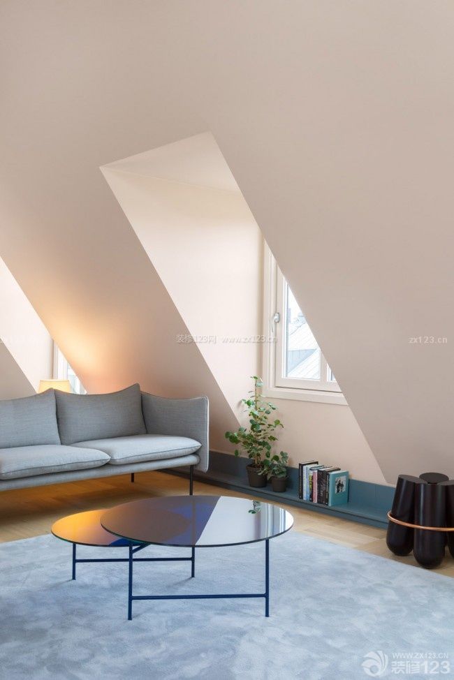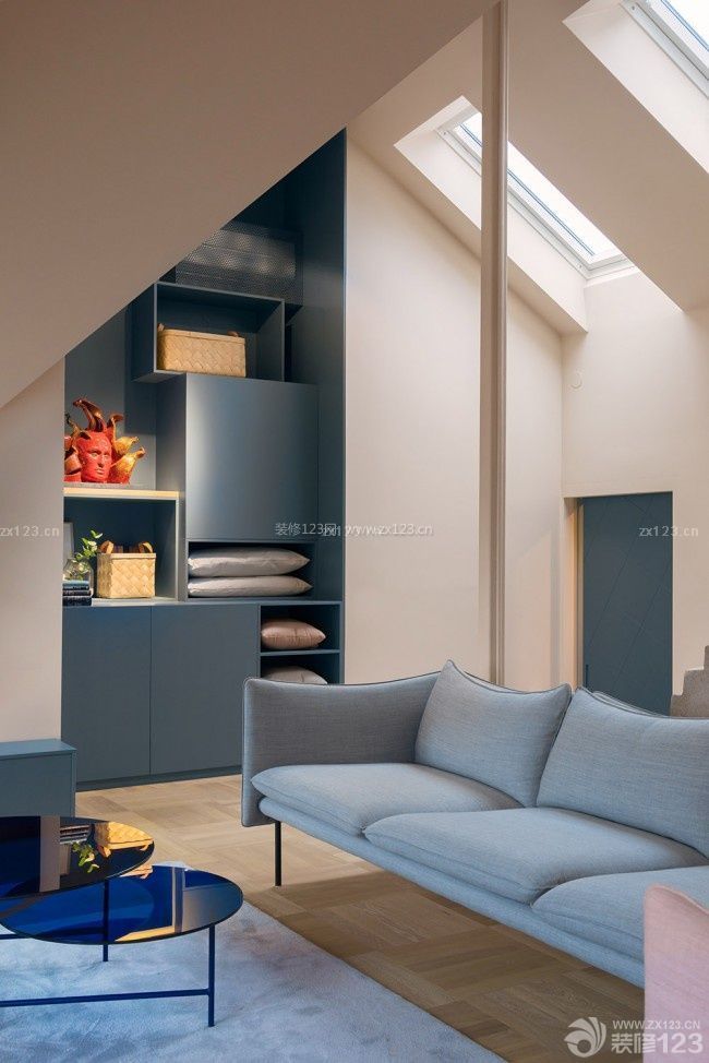 在這個設(shè)計(jì)中,所有的儲物家具采用了藍(lán)灰色,為了削弱閣樓因?yàn)槎赶魑蓓敭a(chǎn)生的不好利用的三角空間,設(shè)計(jì)師打造了大進(jìn)深的儲物家具,創(chuàng)造出經(jīng)典的沙龍氛圍.