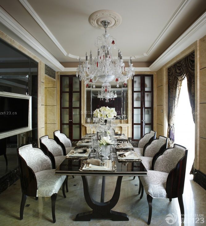 以高品質(zhì)的餐桌椅子搭配精美吊燈,鋪展出奢華大器尺度。