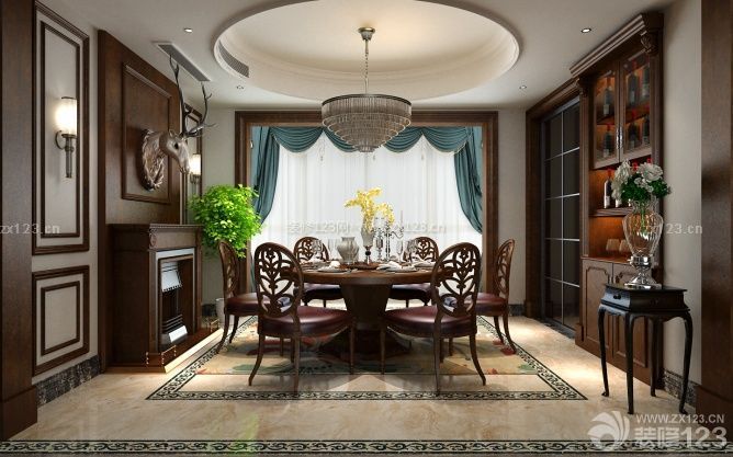 在餐廳的處理上,設(shè)計師將吊頂和圓餐桌相互呼應(yīng),形成中國人喜歡的圓滿意象。而實木家具的搭配,以及精致的餐桌椅設(shè)計,都使空間更加富于變化。