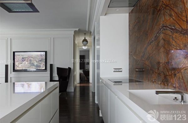 開(kāi)放式廚房的一面深色大理石引人注目,紋理清晰可見(jiàn)。