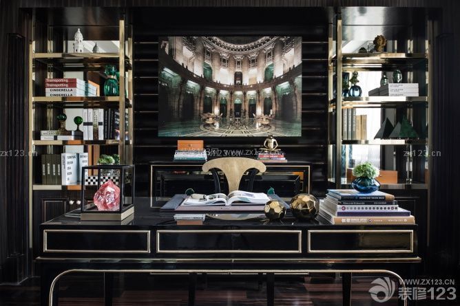 書房兼具會客廳的功能,香檳金的書架熠熠生輝,書架上打坐的金蛙,讓東方的精神和西方的空間融合交織,使整個空間充滿了靈動性。