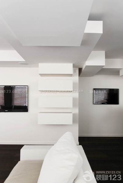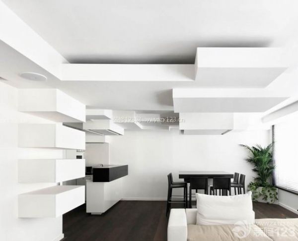 整個室內(nèi)裝飾最壯觀的部分莫過于穿過天花板的懸浮石膏塊以及被廣泛使用的白色墻壁與黑色家具。