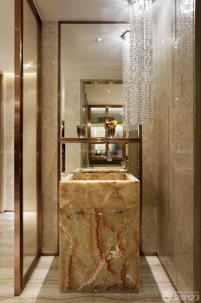 設(shè)計(jì)師用瑪瑙石材作為浴室洗手池,追求舒適、健康、品位的生活成了每個都市人的共性,設(shè)計(jì)師為客戶創(chuàng)造了一種滿載浪漫與奢華的生活韻味。