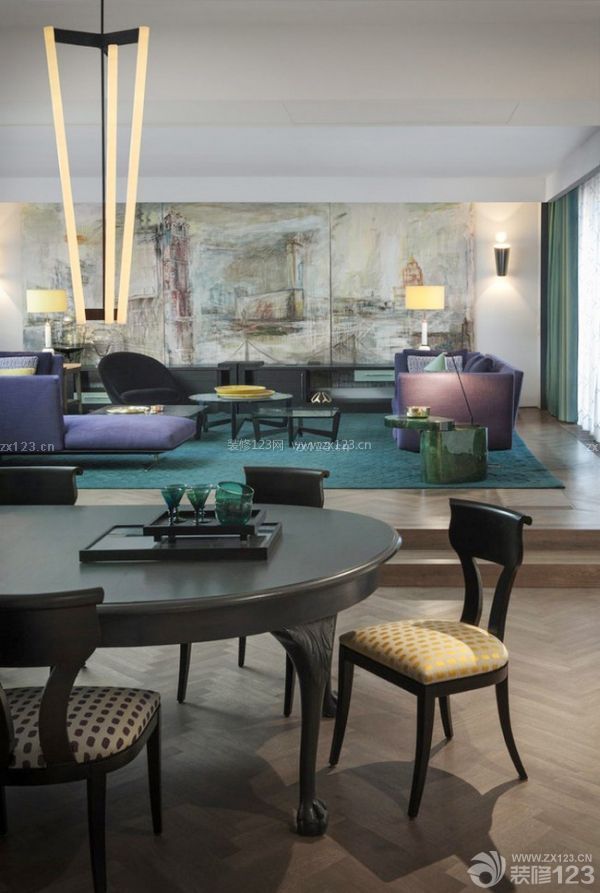 本案顏色調(diào)色板相當(dāng)大膽的紫色座位、 藍(lán)色的地毯,綠色的窗簾和墻上的大型藝術(shù)品。