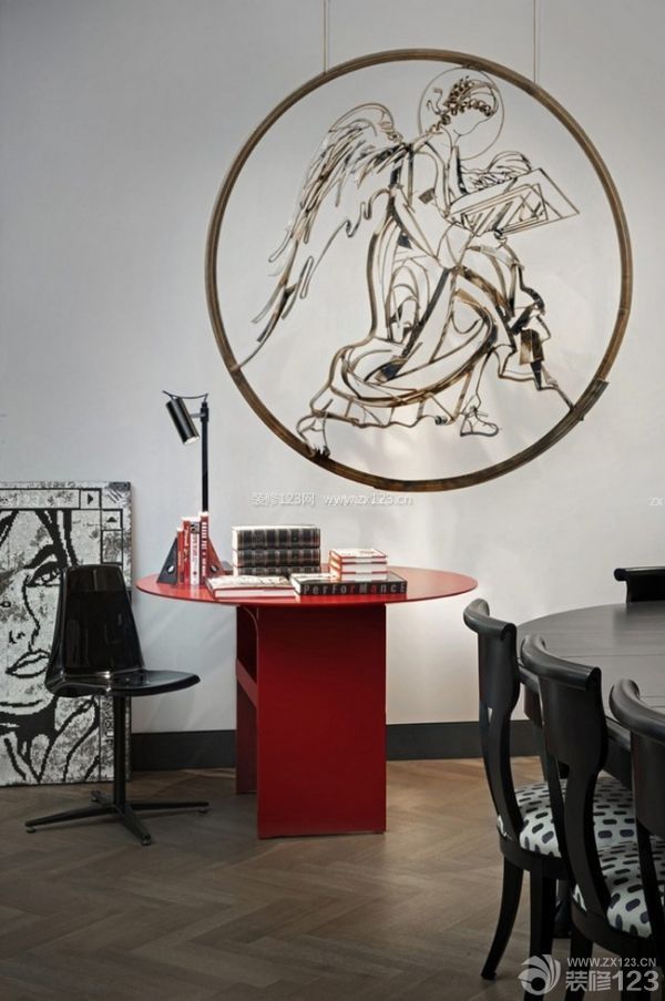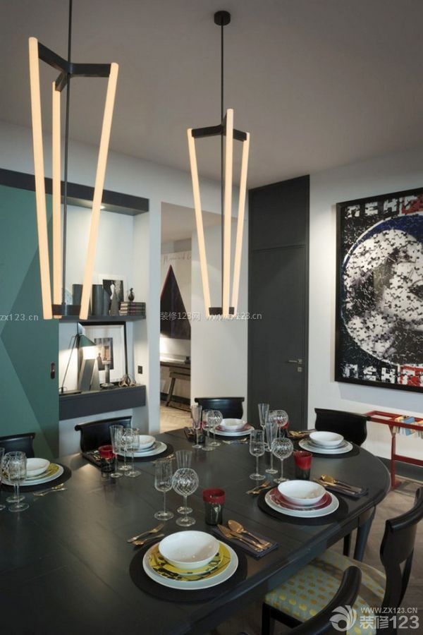 餐廳有一張魚(yú)片的那一塊拼圖等當(dāng)代藝術(shù)的雕塑照明裝置在背景中。