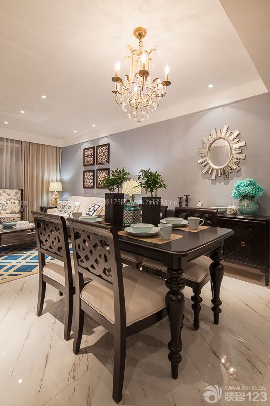 以一副美麗的孔雀圖畫作為玄關(guān)裝飾,玄關(guān)柜作工細膩的描金線板,表達出濃郁到位的新古典元素設(shè)計。