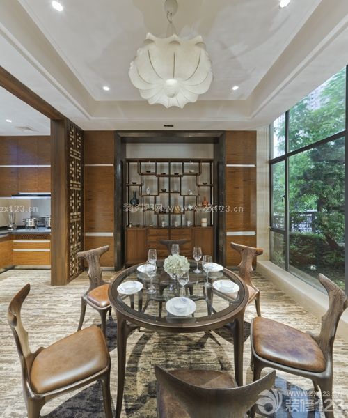 餐廳線條簡潔,格調高雅,沉穩(wěn)的黃金海岸大理石地面凸顯白色餐椅,與白色裝飾壁柜交相輝映,美觀實用,側墻配以抽象裝飾面,與遠端深色的實木凹凸墻面形成視覺上的沖擊,開放式的廚房設施整齊化。