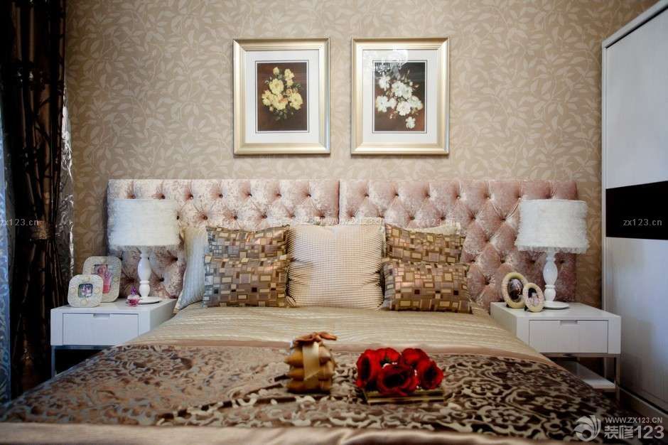 淺粉色繃帶床頭背景,以女主人的愛好為主軸。床上的玫瑰花是男主人為她準備的驚喜。