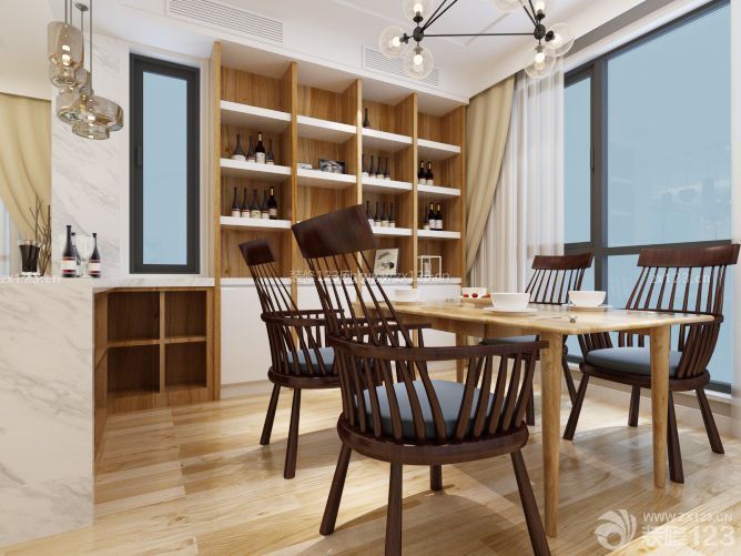 餐廳以棕色底紋的單椅、搭配木質(zhì)餐桌,勾勒出輕松的用餐情調(diào)。