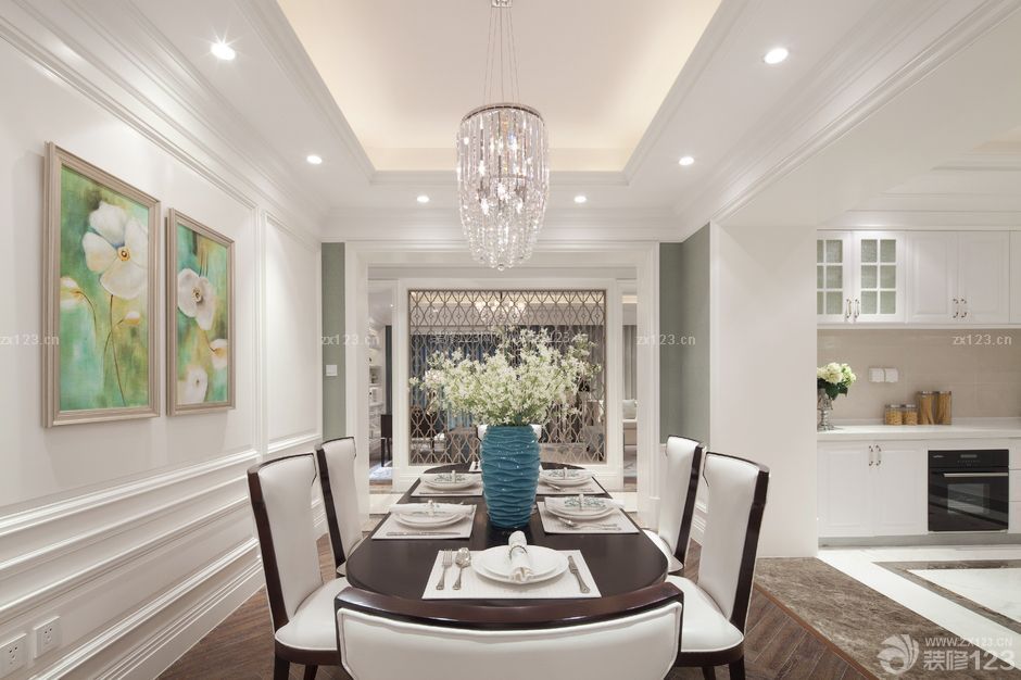 運(yùn)用大量線板、溝縫手法裝飾餐廳空間,搭配上一盞精美水晶燈,大器呈現(xiàn)空間精致度。