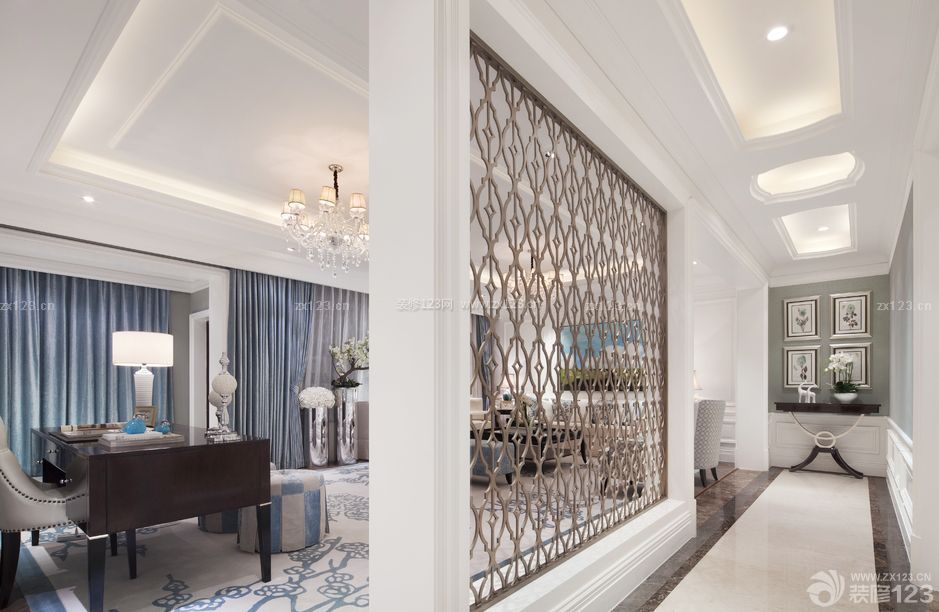 金屬鏤空隔斷設(shè)計(jì),以精品圖騰意象隔斷餐廳與客廳第一眼時(shí)尚,而線條從地面至立面屏風(fēng)開(kāi)展完整了空間獨(dú)立性。