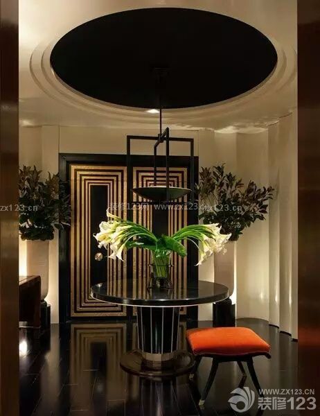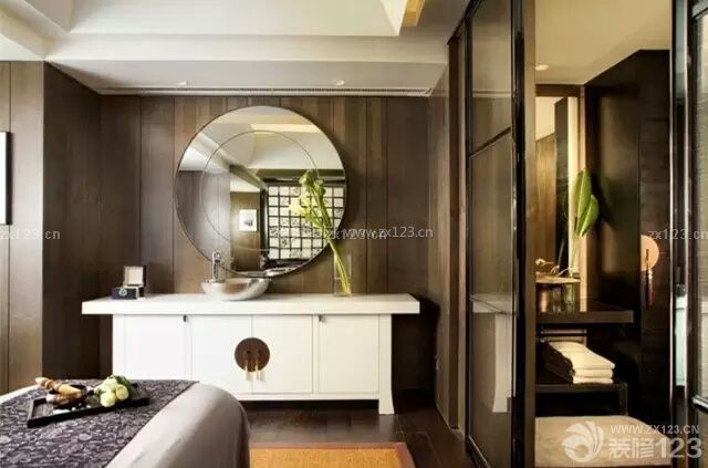 不適合做門(mén)窗的布局,可使用裝飾畫(huà)、地毯等突出方格式設(shè)計(jì),而圓形的月洞門(mén)則巧妙地化為了鏡子。
