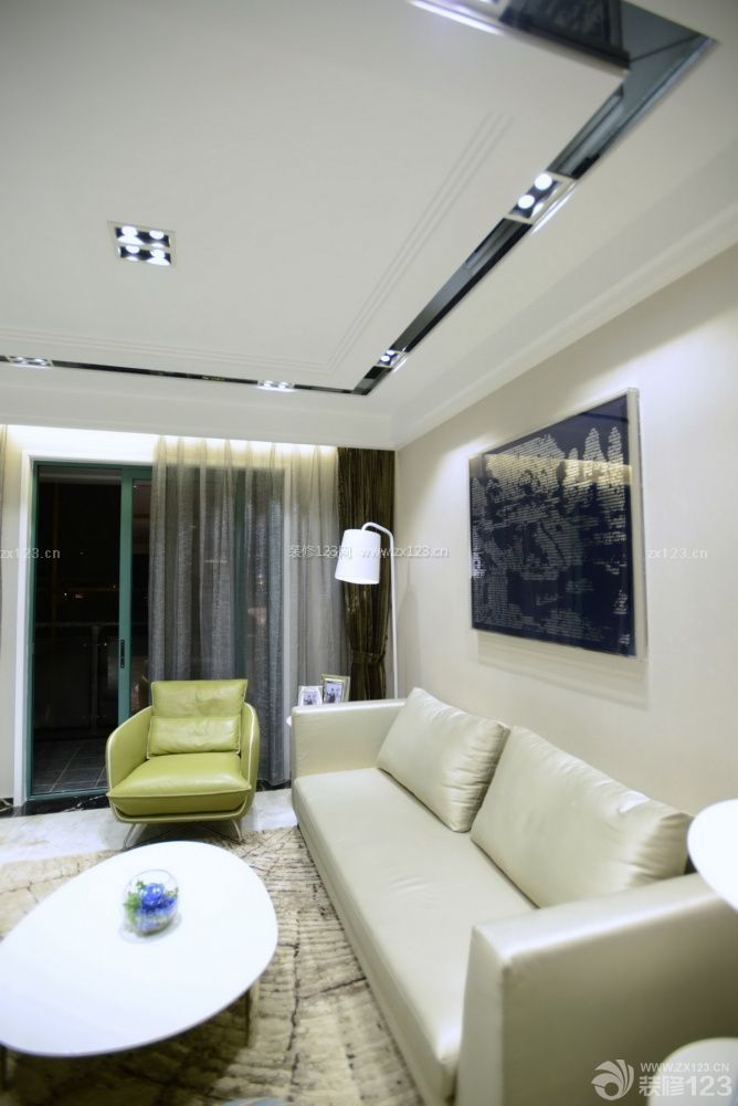 寶藍(lán)色的裝飾畫和淡綠色的沙發(fā)交相映襯寧靜而和諧。