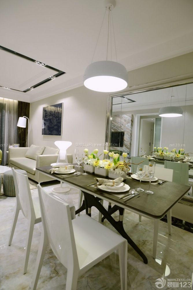 布局上客廳及餐廳連為一體,灰色的地磚和墻紙色調(diào)柔和而淡雅。
