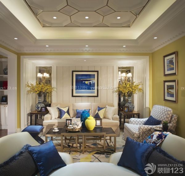 優(yōu)雅的法式經(jīng)典藍(lán)、黃色絲質(zhì)布藝與抽象地毯紋樣、掛畫、燈具相搭配,展現(xiàn)了精致、細(xì)膩兼具自由、奔放的空間格調(diào)。