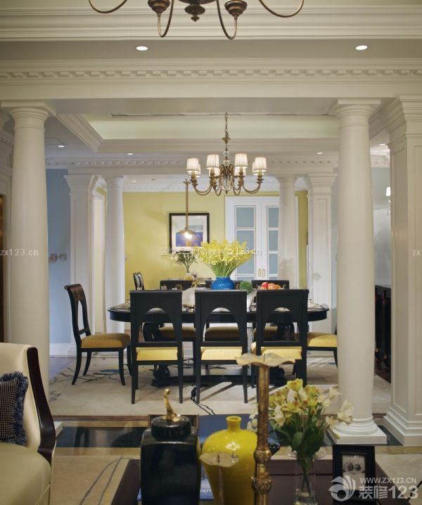 右側(cè)的餐廳與客廳區(qū)域使用了4根白色“多里克式柱”使空間更加大氣,白色柱體自然的融入空間。