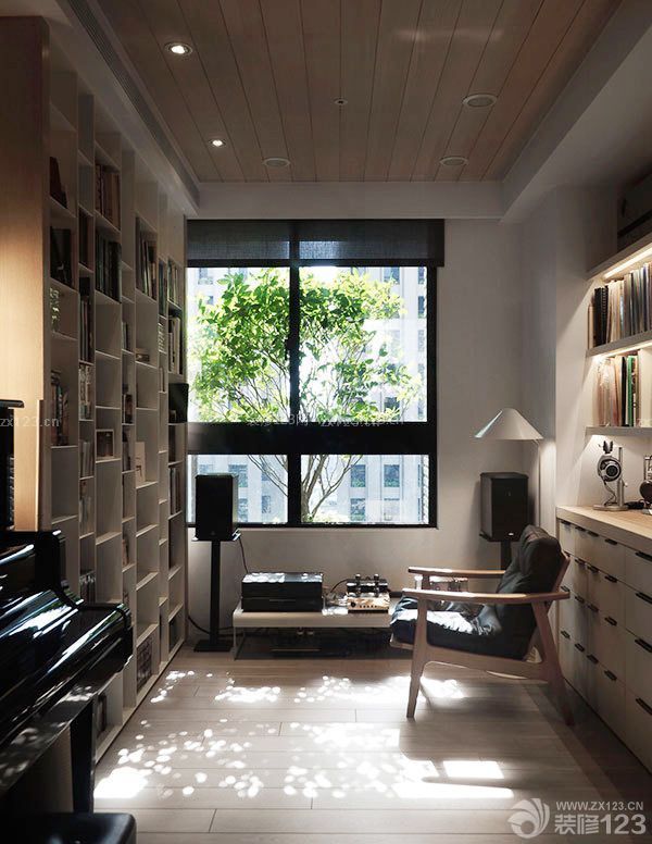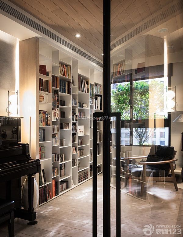 開闊的視野無形間放大空間感,尤其將書房隔間墻以鐵件立柱與通透的玻璃取代,書柜設(shè)計成為望向客廳視角的景深效果。