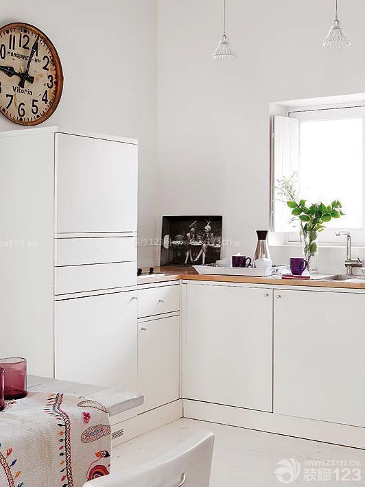 以全白色調(diào)裝飾廚房,讓空間保持統(tǒng)一和諧,擺放一株綠色盆栽增添自然生命氣息。