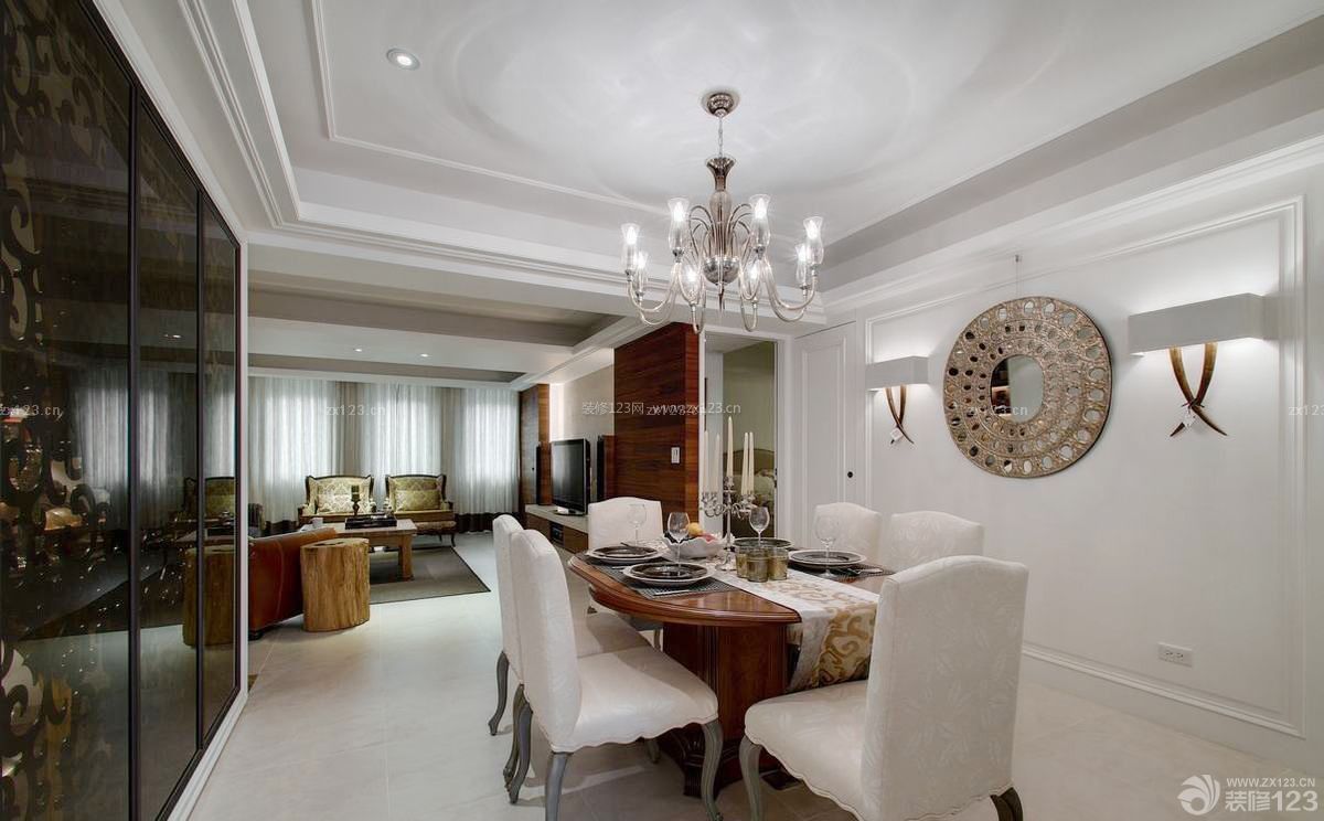 踏入玄關,夾以雙面茶鏡的鐵件屏風,以法式線板包覆中式線條,華麗的繁復感加乘上細膩的留白,疊影出了客、餐廳空間,也帶出整體的混搭風情。