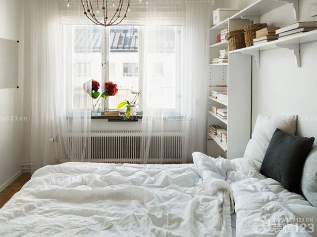 輕柔白色紗簾給人一種輕盈通透的視覺感受。床頭背景墻以實用為主,展示收納。