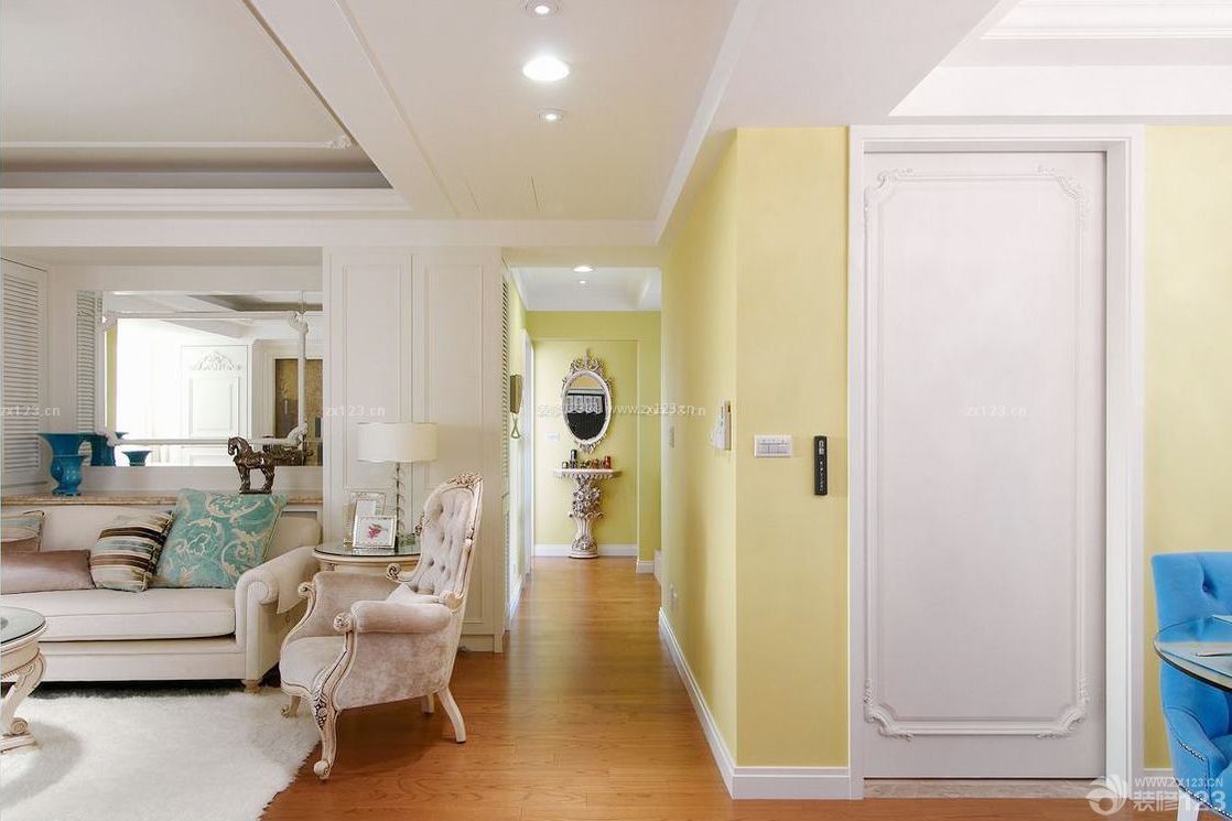 沙發(fā)背墻鏡子兩側(cè)的柜體門片也設計成白色長型百葉造型窗,充份融和美式鄉(xiāng)村和新古典風格的精神。