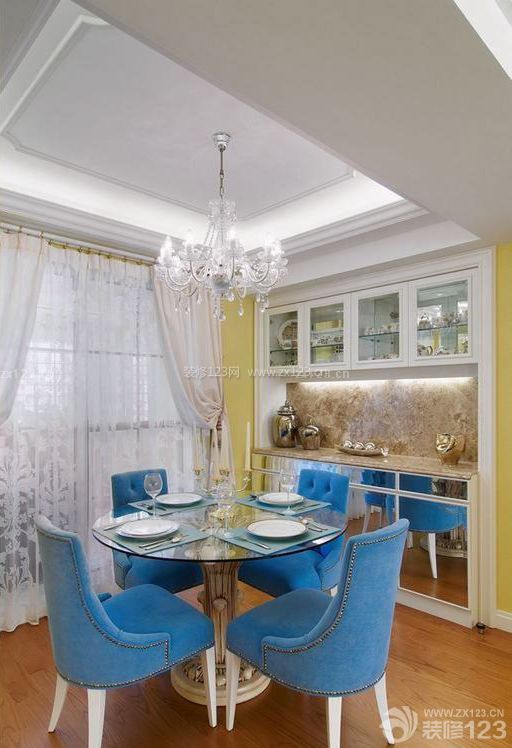 另一側(cè)用餐空間以濃縮方式強烈表現(xiàn),設計師以搶眼的藍色餐椅、璀璨的水晶吊燈、鏡面腰柜門片、與白色背景基調(diào)成為強烈對比,讓視覺上強化新古典的精致印象,以白色和帶有細膩圖案的圖騰裝飾設計。