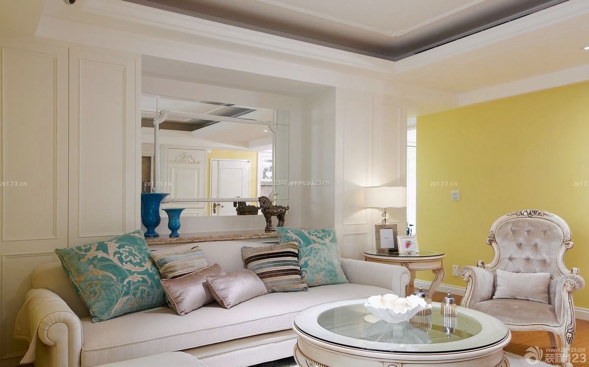 天花線板以多層次素雅的線條勾勒,在沙發(fā)上方的主墻面飾以大片雕花鏡讓空間有加倍放大效果。