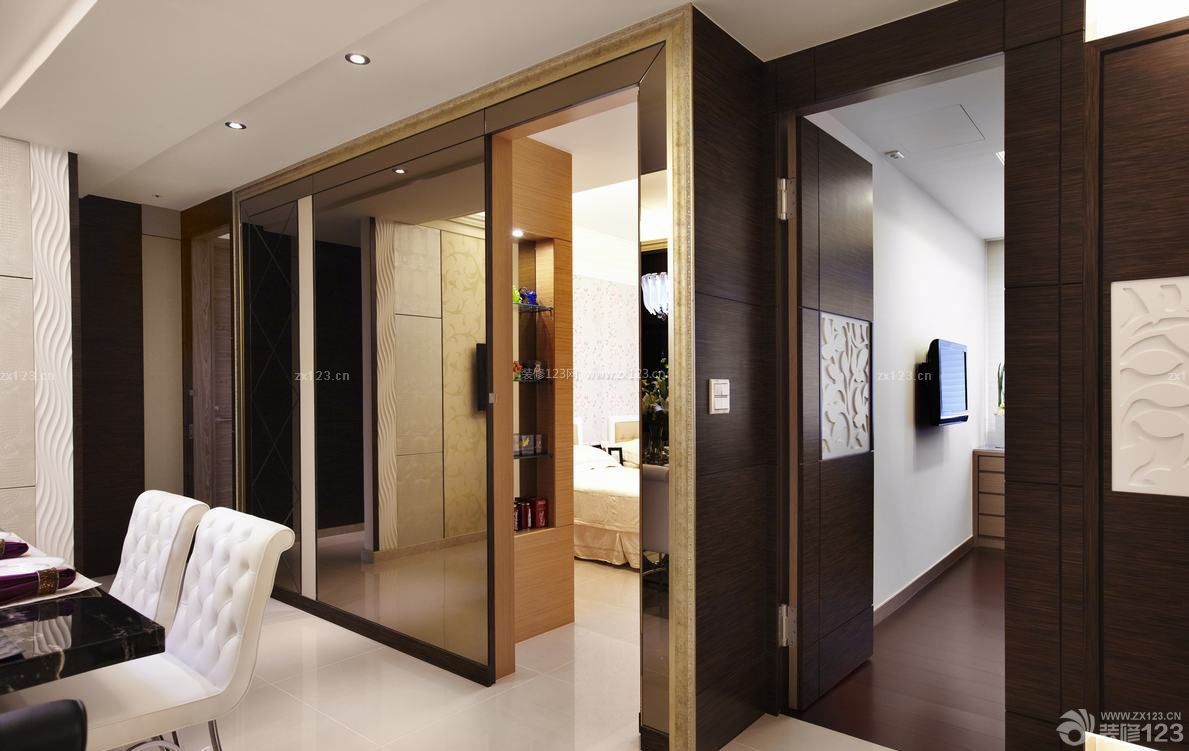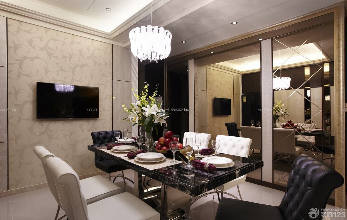 設計師以壁紙、皮革及雕刻板三種建材紋理豐富電視墻面線條,而在餐廳兩側,設計師運用大量茶鏡、皮革、木皮,搭配出放大豐富的空間感。