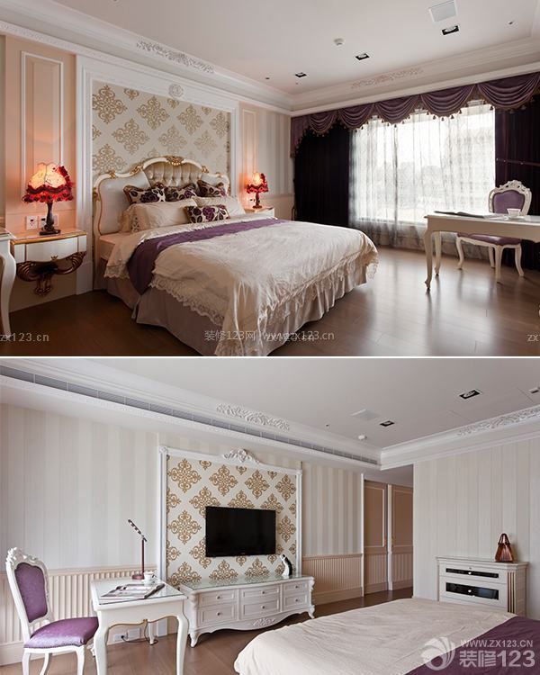 紫色系的神祕高雅是屋主最愛,壁紙混搭再以線板為框,巧妙定位出電視主墻面。
