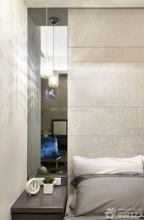 主臥床頭主墻以進(jìn)口壁布與茶鏡配置吊燈燈飾,規(guī)劃出空間浪漫而典雅的休憩氛圍。