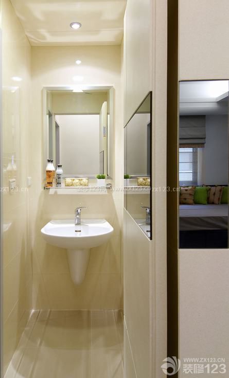 洗手臺(tái)面以俐落方式規(guī)劃,明鏡的安排,維系空間延展的效果。