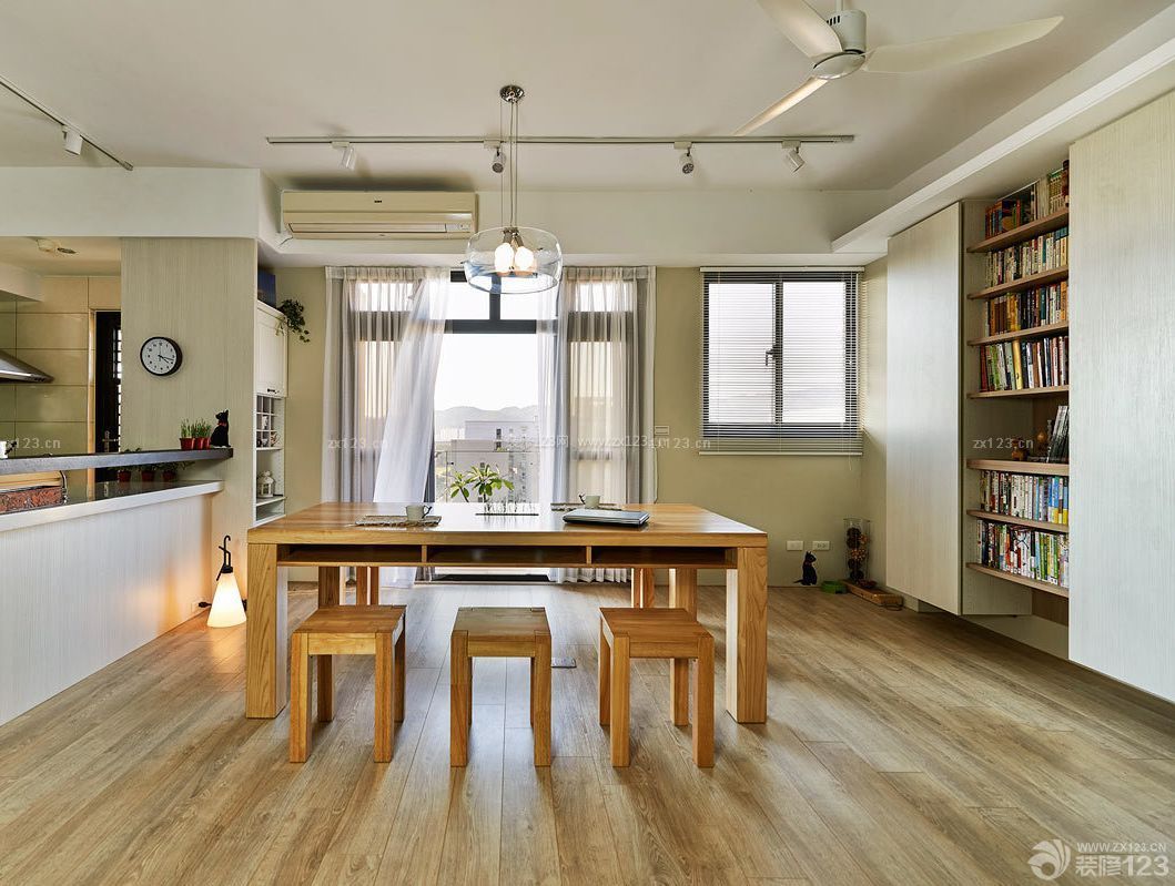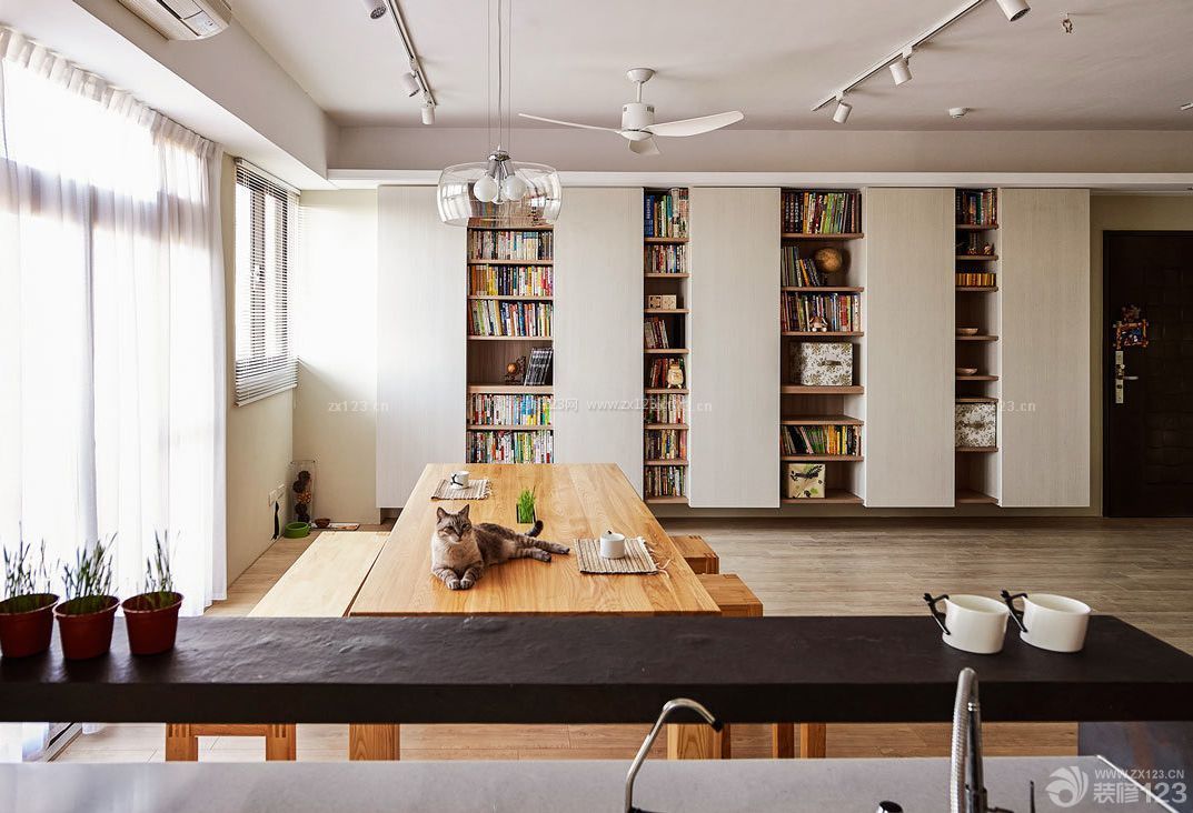 吧臺、餐桌、書柜,構(gòu)筑為同一條視覺軸,并將書柜作為空間的端景,讓全室彌漫文藝的芬芳。