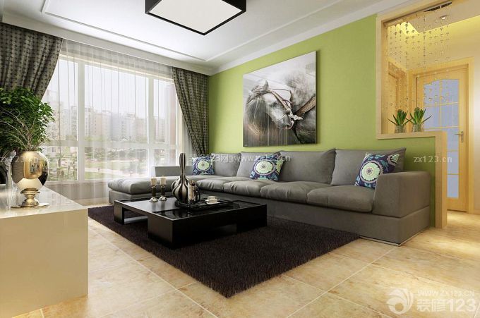 客廳中放置著清晰線條的灰色布藝轉(zhuǎn)角座沙發(fā),一種簡約中的大氣之感。而沙發(fā)的背景墻則是以青色的乳膠漆刷至而成,上面掛置著灰色為主花樣的油畫,與整體風格相協(xié)調(diào)。