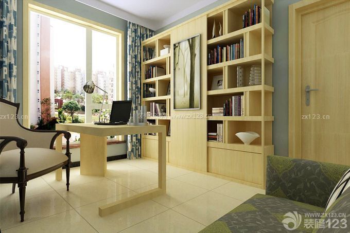 書房中四周墻以藍灰色的如乳膠漆刷至而成,一種清新雅致之感。一面墻上整個的以原木整體櫥柜裝飾而成,中間則是掛置著簡約的畫作,寂靜中的藝術氣息。