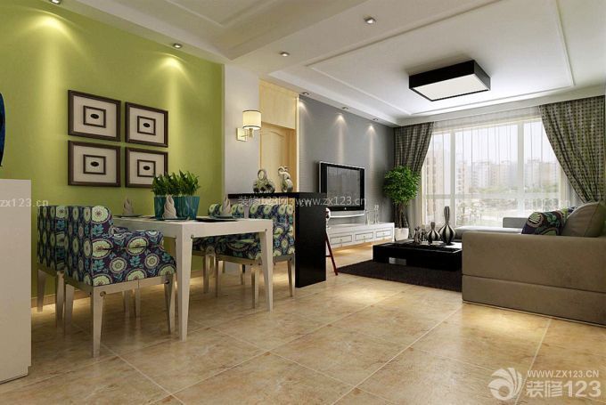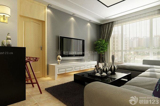 客廳中電視的背景墻以灰色的乳膠漆刷至而成,下面則是以清晰線條的白色視聽柜為設計,一種簡約大氣之感。地面則是以黃色的地磚為鋪貼,很是溫馨舒適。
