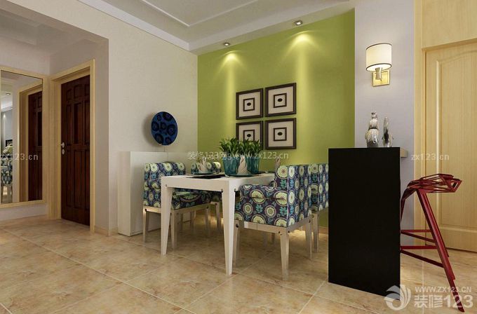 餐桌以清晰線條的白色原木為材質(zhì),搭配上藍青花樣的座椅,而餐桌里面的整個背景墻以青色的乳膠漆刷至而成,一種清新自然之感。