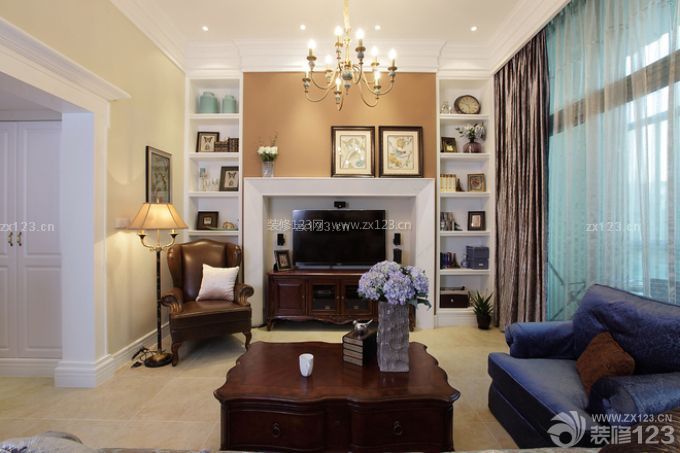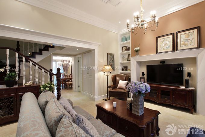 客廳中沙發(fā)的對面是電視的背景墻裝飾,其中電視的背景墻以玄關(guān)設(shè)計,分為上下兩層,而上班層則是以粉咖色的乳膠漆刷至而成.