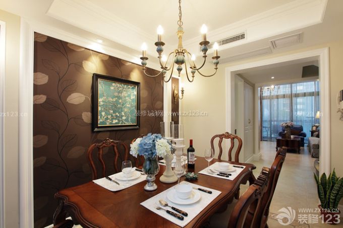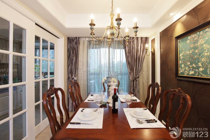 餐廳以充滿曲線感的金屬鐵藝吊燈為裝飾,很是靜美。一旁的白色原木為框的透明玻璃移門,很是貞潔雅致。