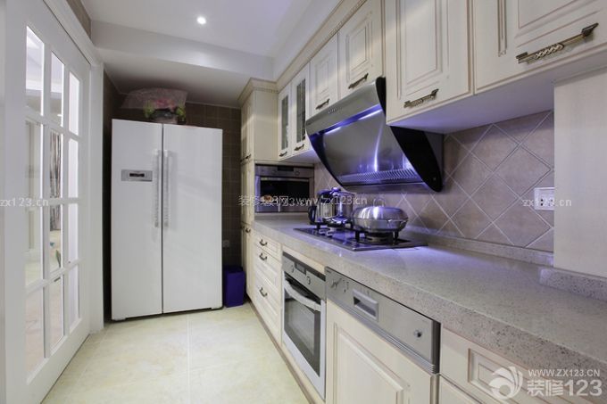 廚房整個的以白色裝飾而成,白色的整體櫥柜搭配上淺灰色的臺面,干凈易打掃,菱形狀的小塊瓷磚有一點復(fù)古的味道。