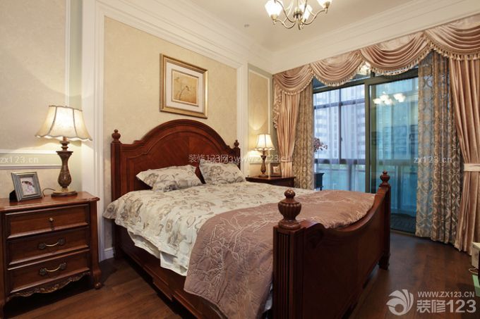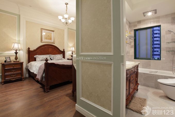臥室的地面以棕色的原木地板為鋪貼,在有著古色之時更是充滿著歷史感。這四周的墻面上則是以米色紋絡(luò)狀的壁紙為鋪貼,加上青色的框,顯得雅致溫馨。