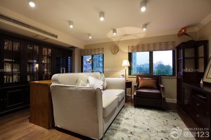一面墻放置著簡(jiǎn)約線條的深棕色原木整體書(shū)櫥,加上透明玻璃窗的設(shè)計(jì),透露著小資情調(diào)。這邊則是放置著簡(jiǎn)約線條的米色布藝沙發(fā),讓屋主有了一個(gè)安靜舒適的閱讀空間。